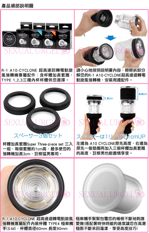 R-1 A10-CYCLONE 超高速迴轉電動旋風強轉機最新專屬配件『It’s Free』內裝杯體,實現您天馬行空的創意與激情夢想。你可以在『It’s Free』內杯當中加入任何柔軟無危險性材質的東西,體驗不同的高潮樂趣