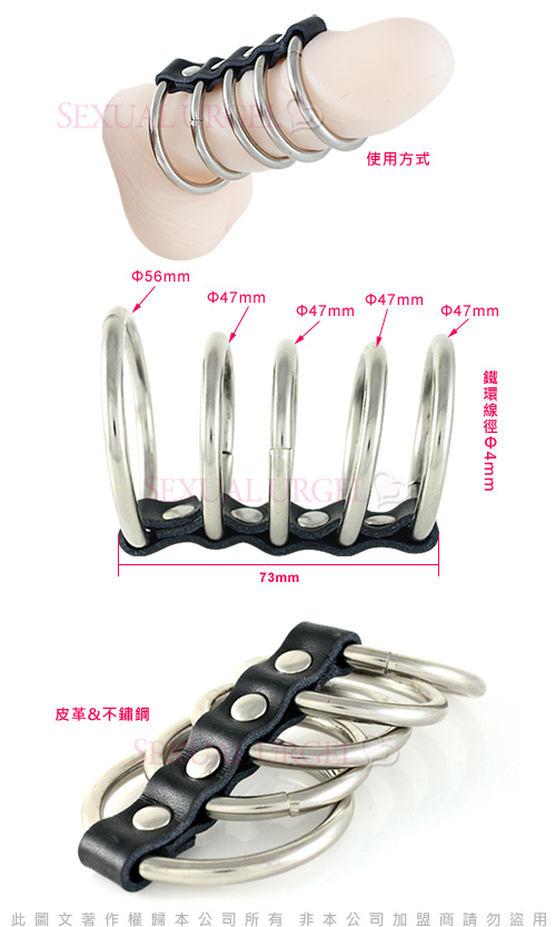 本品由不銹鋼與皮革製作,由一大四小五隻陽具環組成,並以皮革扣帶相連,大環直徑5.6cm,四隻小環直徑4.7cm。使用時可將五隻陽具環依次套在勃起的陽具上,增加男性性感與功能。