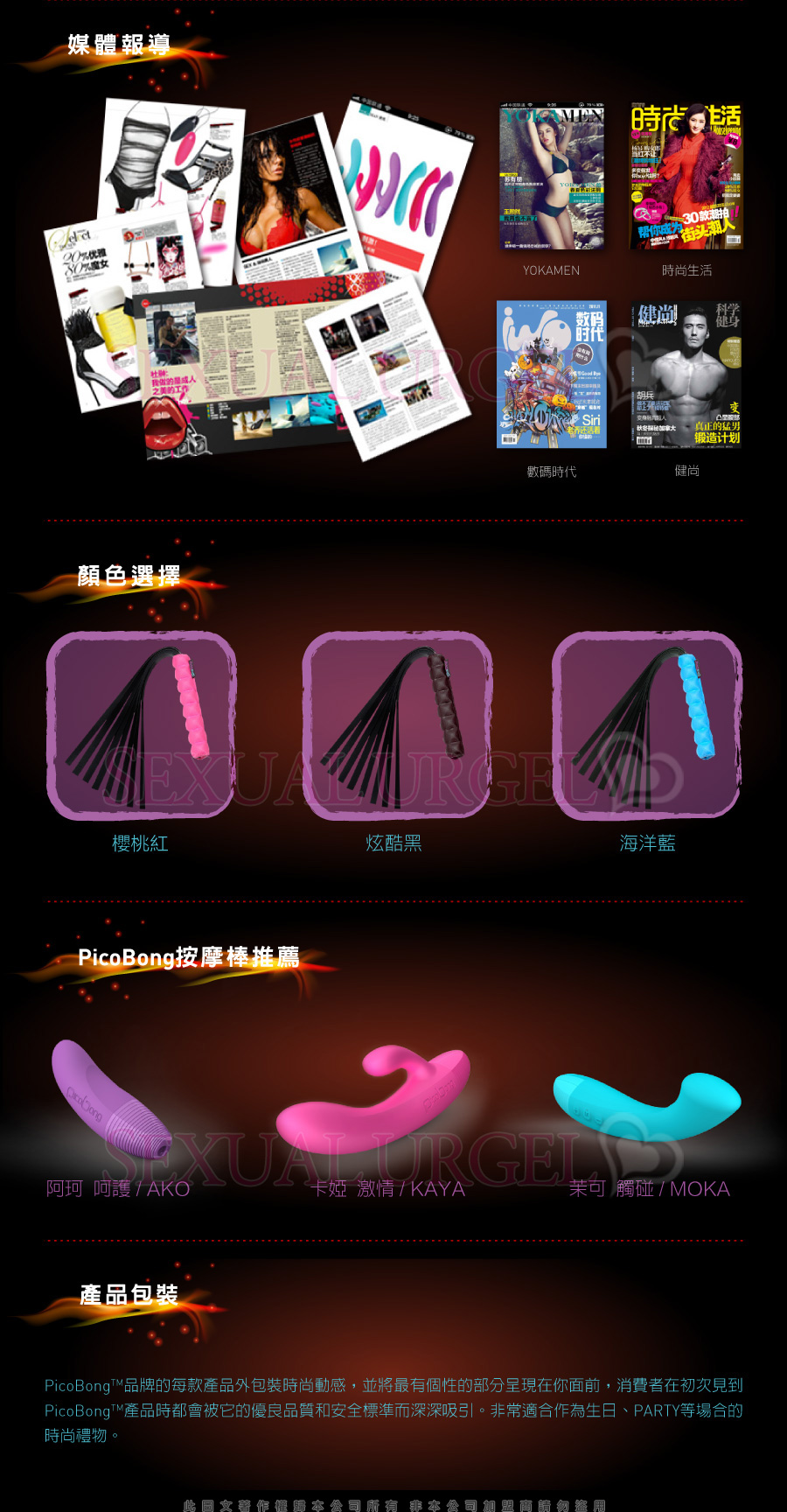 色彩明亮的產品帶來有滋有味的激情遊戲。包裝俏皮、時尚、雅致。