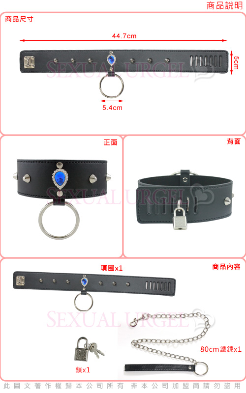 .商品名稱:虐戀精品CICILY-寶石癡女-皮革鉚釘頸銬(含鏈鎖)