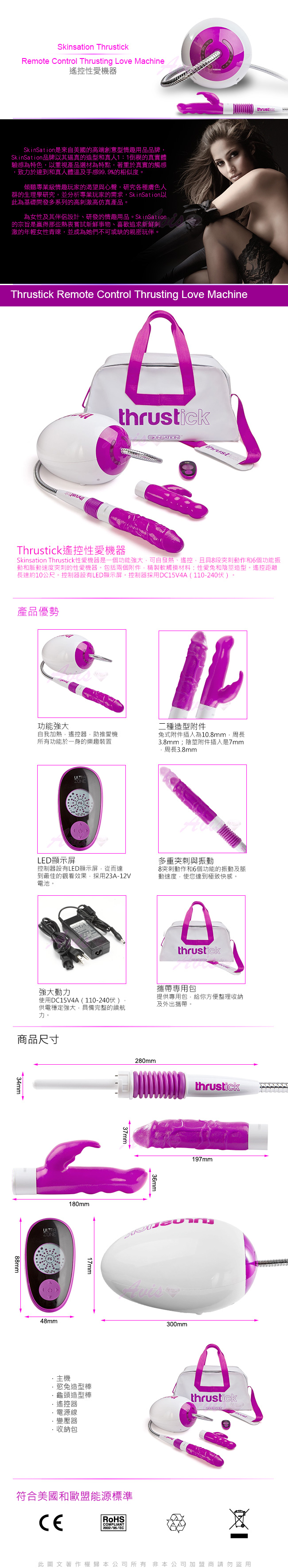 .Thrustick遙控性愛機器是一個功能強大,可自發熱、遙控,且具8段突刺動作和6個功能震動和脈動速度突刺的性愛機器,包括兩個附件,精緻軟觸摸材質,性愛兔和陰莖造型,遙控距離長達約10公尺,控制器設有LED顯示屏,控制器採用DC15V4A(110-240伏)
