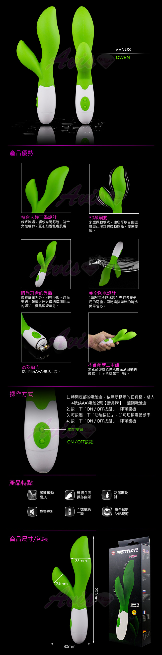 .主商品:OWEN 歐文-多功能雙震動 30頻 時尚精品智能按摩棒-綠x1