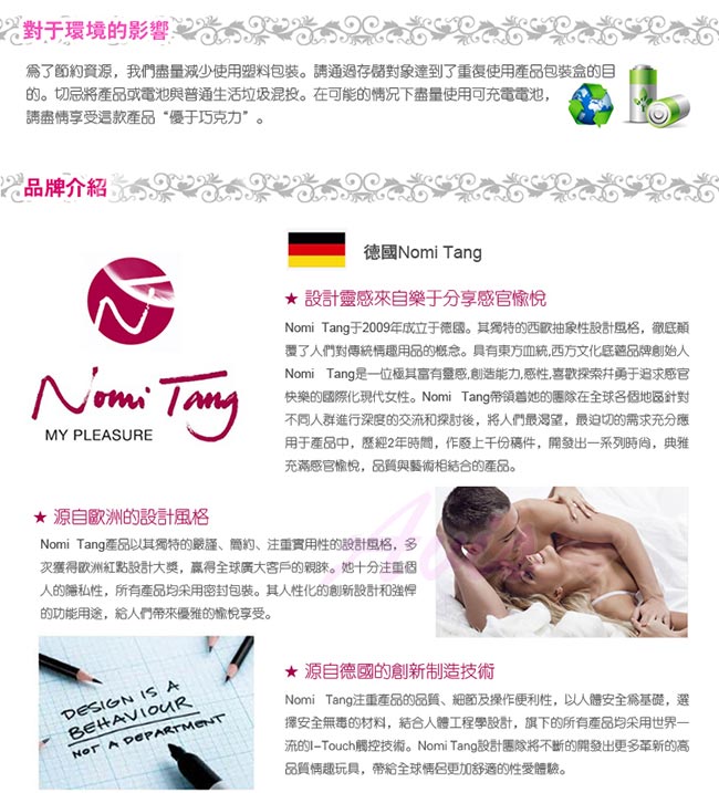 濃情巧克力是由優質親膚型材料設計製作,能提供較長年份的使用滿意度。但是Nomi Tang不會因獲此殊榮而止步不前:這個年輕的品牌將在濃情巧克力產品的成功基礎上繼續發布的新產品