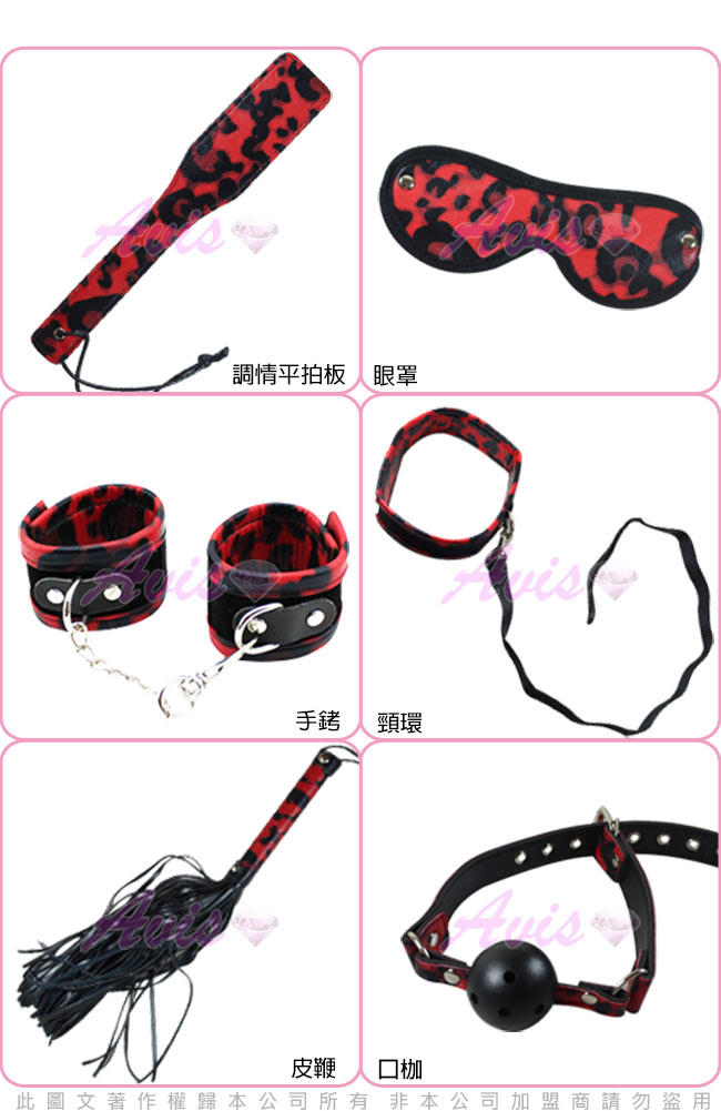 SM紅色豹紋套裝六件組 :眼罩、頸圈、口咬球、雙手環、皮鞭、皮拍