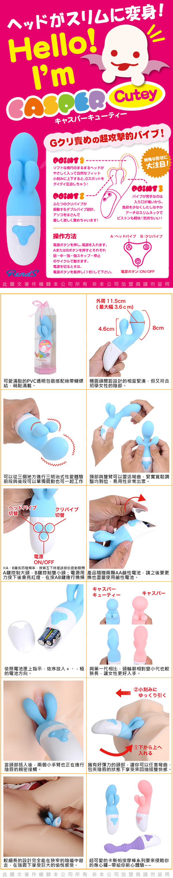 .商品內容:日本RENDS  CASPER CUTEY 鬼馬小精靈 4段變頻 三頭強震G點按摩棒 藍