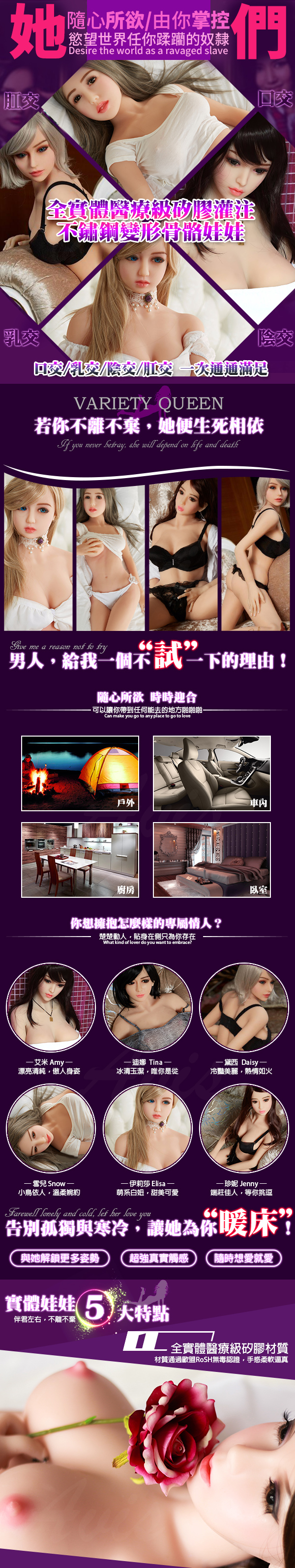 使用部位:陰交、肛交、口交三用,內置合金骨骼可固定姿勢,關節可動,可隨意變更姿勢