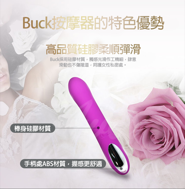 Buck充電式4頻旋轉7頻震動按摩棒以最新科技素材,將按摩棒的表面變得柔細