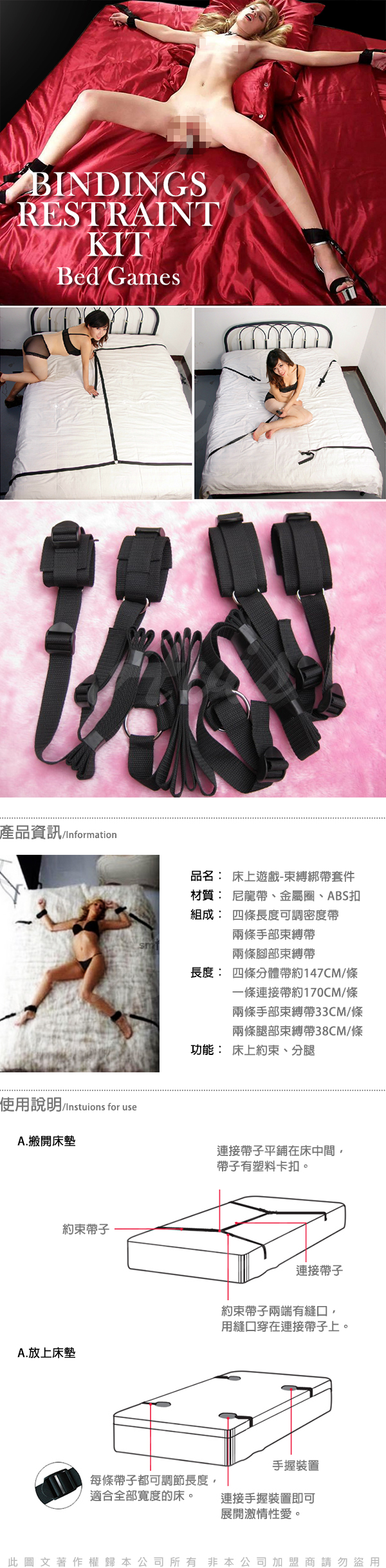 .商品內容:虐戀精品CICILY  SM調情睡床綁帶捆綁束縛組 BDSM道具