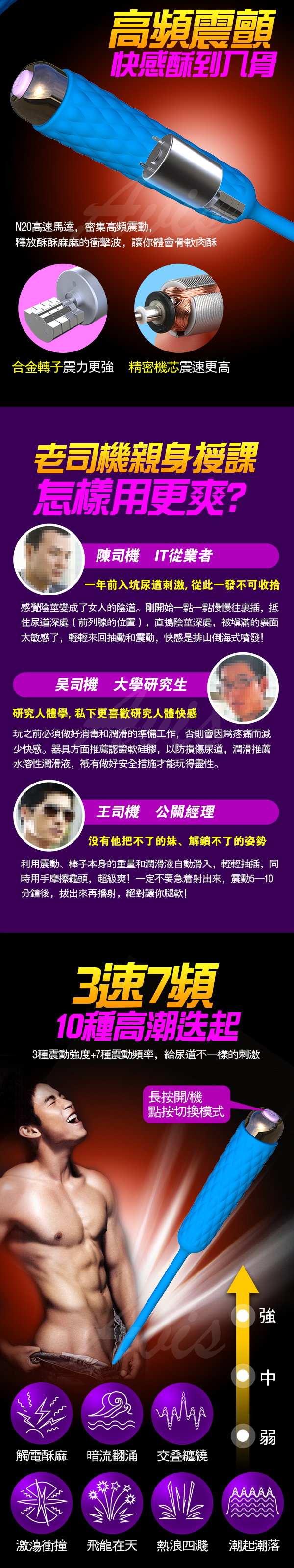 探索尿道刺激器攪弄尿道男人也會潮吹!此款採用軟體矽膠輕柔不怕受傷!刺激尿道,酥麻快感循環襲擊,使高潮在臨界點邊緣徘徊,直到汁液噴射,比女性潮吹來要猛烈。3速7頻高頻震動又插又震的使您快活似神仙!震顫尿道多處敏感點,帶來被充實的飽漲感