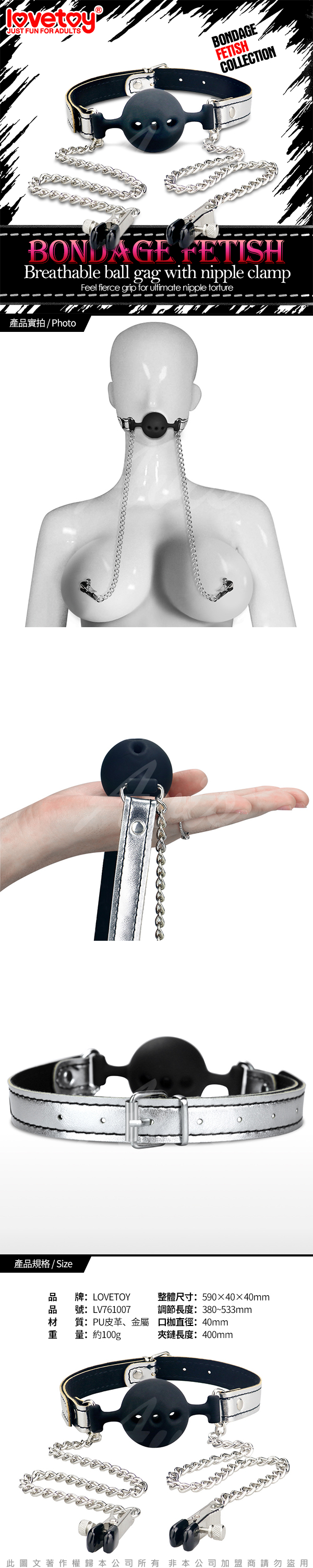 .商品內容:Lovetoy BONDAGE FETISH 虐戀系列-口枷皮革頸套+乳夾