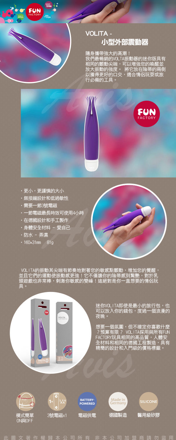 VOLITA採用與所有FUN FACTORY玩具相同的高品質,人體安全材料和相同的德國工程製造,具有精簡的設計和入門級的價格