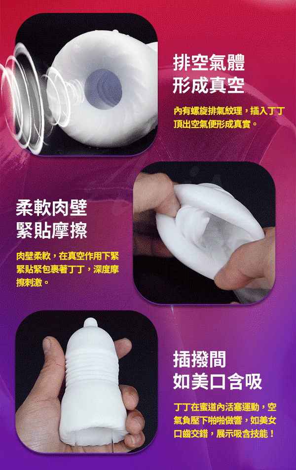 運用幻覺空氣動力構造,推動高潮的進步,給你非同一般的享受爽到欲拔不能~擁有三段負壓真空構造形成強力真空及厚重真實的包裹著老二感增加摩擦感猶如迷失在幻境通道般。採用虛擬膚質材質,柔軟Q彈享受肌膚舒適快感更加銷魂真實練就不倒金剛槍。
