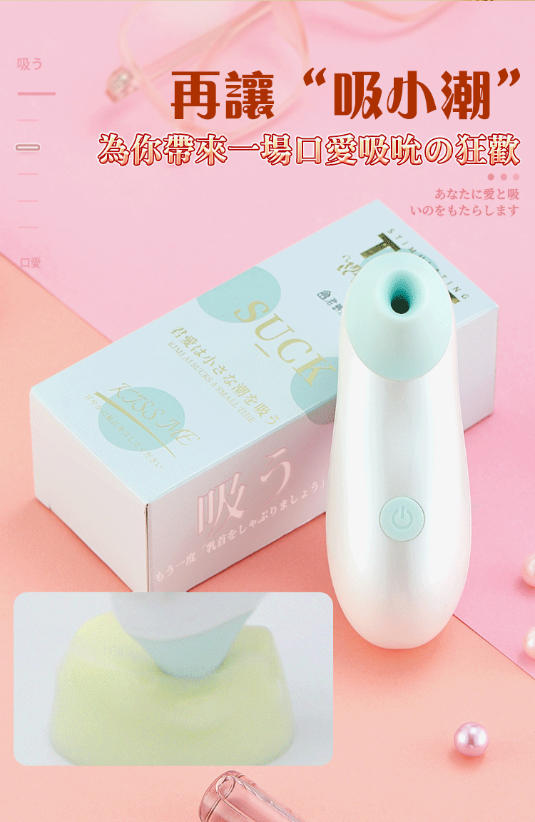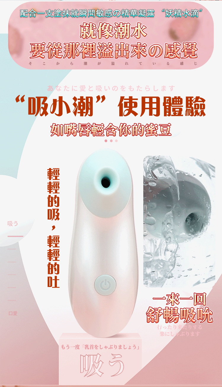 吸小潮吮吸器,撩撥您身上所有敏感部位不管是耳垂、咪咪或是蜜豆都能輕鬆刺激到!!!擁有3速+7種波段吸吮每一種模式都能帶給您不同的感受喔~此款造型可愛小巧便攜,吸小潮將是您外出時的不二選擇高潮