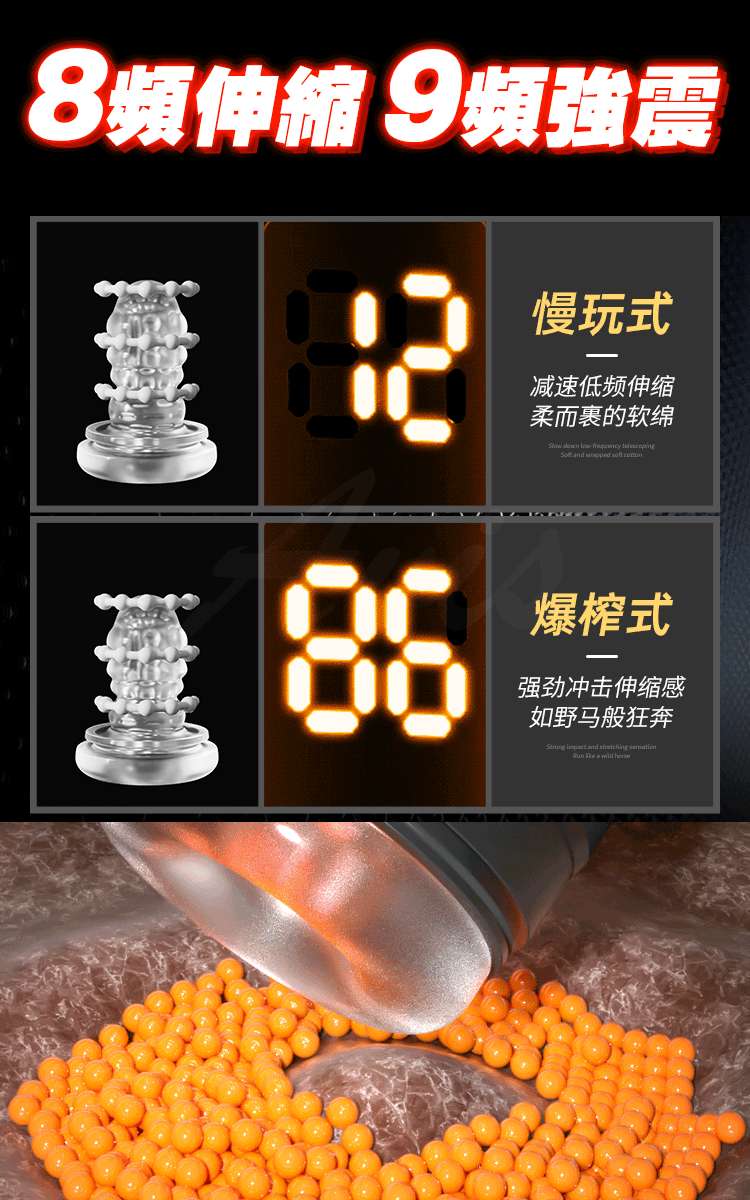 - 混合震感與伸縮模式:8頻伸縮搭配9頻震顫,雙動力設計,帶來節奏變化的無限快感。
